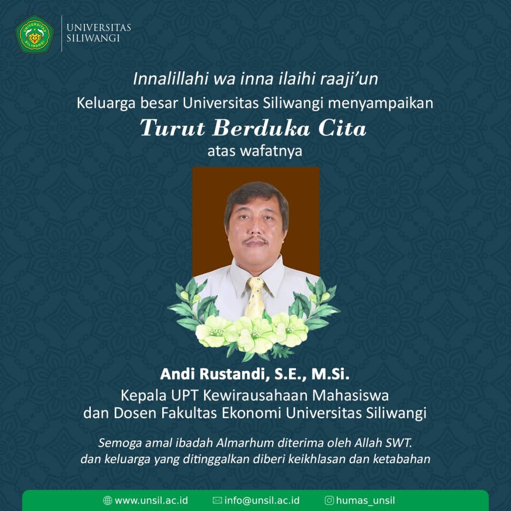 UNSIL kembali berduka, telah berpulang ke Rahmatullah Bapak Andi Rustandi, S.E., M.Si. Kepala UPT Kewirausahaan Mahasiswa dan Dosen Fakultas Ekonomi Universitas Siliwangi. Keluarga besar Universitas Siliwangi menyampaikan turut berduka cita, semoga amal ibadah Almarhum diterima oleh Allah SWT. dan keluarga yang ditinggalkan diberi keikhlasan dan ketabahan. Aamiin Ya Rabbal Alamin.