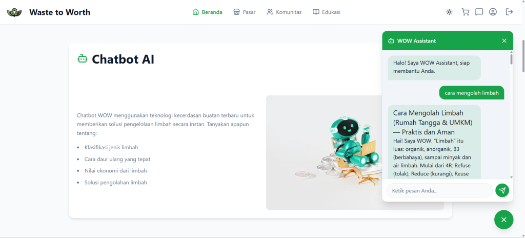 Chabot AI yang membantu pengguna menavigasi platform, menjawab pertanyaan seputar limbah, memberikan rekomendasi bahan yang sesuai dengan kebutuhan pengrajin, serta menampilkan informasi tentang cara pengelolaan limbah yang tepat.