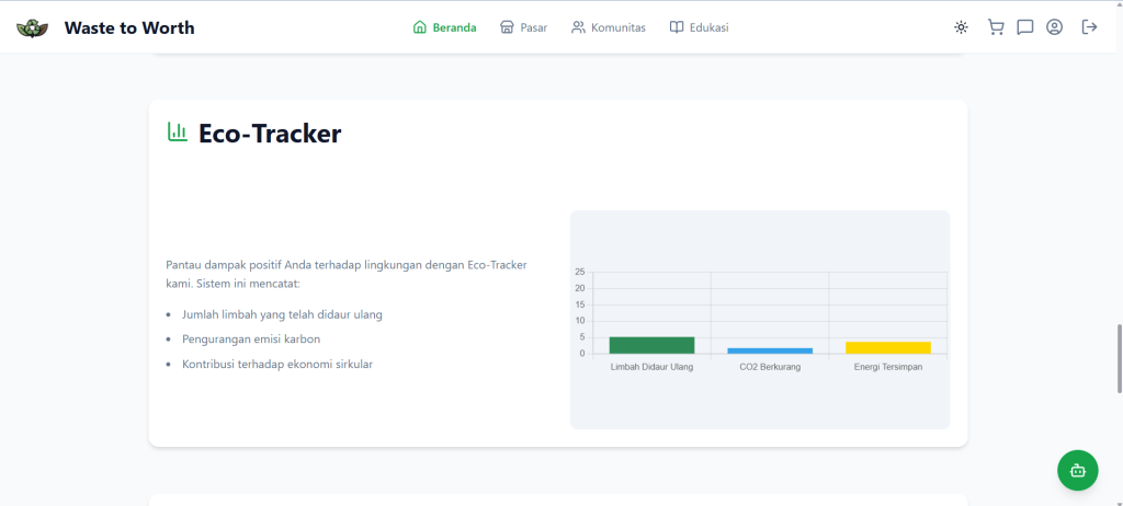 Chabot AI yang membantu pengguna menavigasi platform, menjawab pertanyaan seputar limbah, memberikan rekomendasi bahan yang sesuai dengan kebutuhan pengrajin, serta menampilkan informasi tentang cara pengelolaan limbah yang tepat.